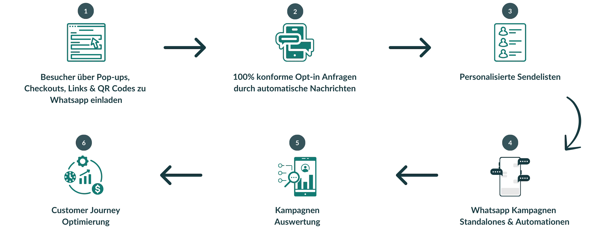 Jede technische Lösung für WhatsApp - Marketing enthält umfassende Analyse- und Reporting-Tools, die es dir ermöglichen, verschiedene Metriken zu verfolgen. So könnt ihr z.B. Öffnungs- und Klickraten eurer Nachrichten messen, die Konversionsraten überwachen, die Interaktionen eurer Kunden nachverfolgen und vieles mehr.