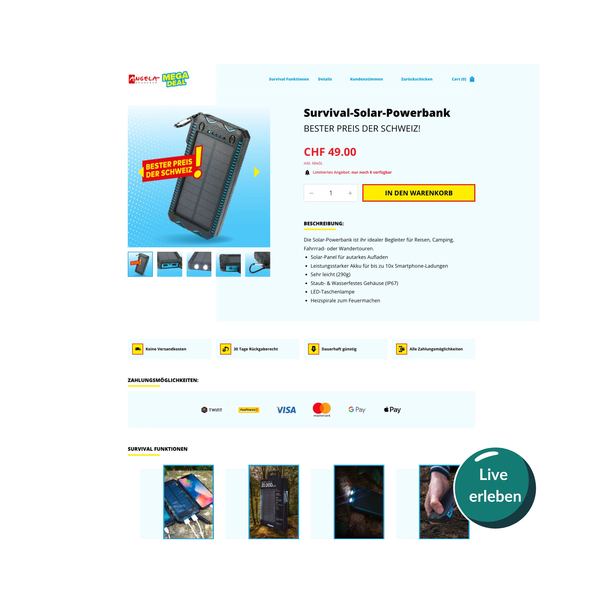 Conversionoptimierte One Page Online-Shop Lösung, mit der ein einzelnes Produkt (inkl. Variantenartikel) in den Vordergrund gestellt wird und dem Käufer alle wichtigen Informationen auf einen Blick liefert.