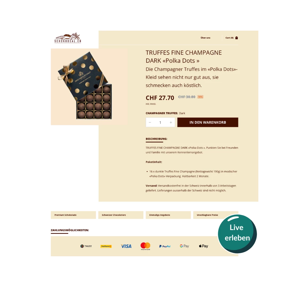 Schnellster Checkout der Schweiz, da die Zahlungsanbindung bereits vorhanden ist. Das heisst wir übernehmen für dich den ganzen Zahlungsprozess. Du lieferst "nur" die Produkte nach den Bestellungen aus.